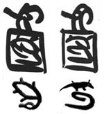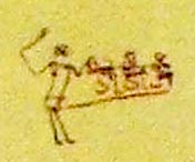 There are two other finds from Tharkan (tombs 315 and 1549) found by Flinders Petrie during the same season (picture right). On two cylin- drical vases (Petrie Mueum in London) sereks were roughly painted and in 1992 these were considered to be depictions of King Crocodile by the German Egyptologist Gunter Dreyer. This interpretation is highly questionable (to this author at least) and the objects rather look like a plucked goose (left version) than a crocodile with a figure possibly looking like a stylized water wave (right). The goose was an "ordinary" hieroglyph and appears in the king lists made half a millennium later in the cartouche of king Sened from the second dynasty. It would take over 1.400 years before the crocodile became the insignia and name of a king in Egypt again. A row of pharaohs took this animal to their hearts and titles during the troublesome period of dynasty 13 at the end of the Middle Kingdom.