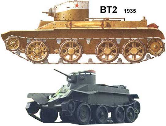BT 2 data: Weight: 11,50 tons Length: 5,81 m Width: 2,23 m Height: 2.20 m Armour: 6-13 mm Gun: 37 mm Engine: 400 hps Speed: wheel/track: 72/52 km/h Crew: 3 Range: 120-300 km |