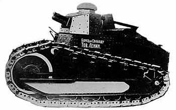 This tank from 1919 was nicknamed "Russian Renault" because a French tank from WW2 was the prototype and French engineers assisted. The engine was a sample from the FIAT automobile. The first tank from August 1920 (picture) was called "Fighter for freedom - comrade Lenin". 15 vehicles were delivered until May 1921, and all had individual names. KS 10 made service in auto-armoured units 1921-1929 and went out of duty in April 1930. Note the floating block(!) at the side which could not have worked. | |
