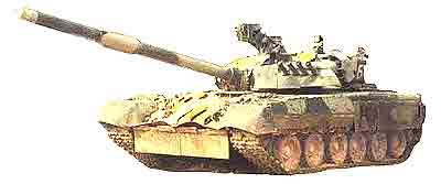 T80 is a further development of the T64. It was first produced in 1983. It is equipped with a 125 mm main gun and possesses many of the same complicated systems which the original T64 had, but free from problems. T80 has much thicker turret armour and the hull is protected by composite active armour. ABC-protection is standard and diving ability to 5 m depth. It is estimated that over 20,000 units were in operation by 1997 in Russia and the number was growing as its successor to be, T90, still was in a low level of production. This model was the first main battle tank in the USSR to use a gas-turbine engine.