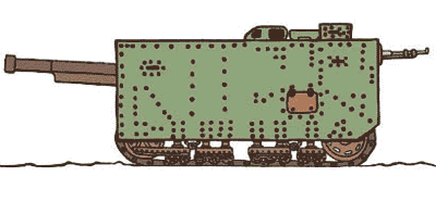 This anonymous heavy armoured "cube" was sketched out in 1915, and probably never came off the dawing board. Despite the fact that it lacks a real turret, it looks much alike the land cruising "submaine" called "The land Cruiser" made by Men- delejev the same year (see menu left). Notable is the small wheels keeping individuel preasure on the bands, just like on modern vehicles. The only facts known about it is the weight, said to be about twenty tons. If this figure is estimated or comes from a full scale unit is unknown. Built as a prototype or not, the heavy gun and its weight would have made it useless as a combat vehicle anyway, not to mention how the crew should react when fireing it inside this crampy space. | |