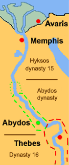 When the Hyksos captured Memphis around 1650s BC. and founded the 15th dynasty, the regions of Abydos and Thebes had their own (Abydos dynasty and 16). After 20 years records tell about clashes between Hyksos and Thebes indicating that the Abydos was conquered by the Hyksos just as Thebes later was, for a brief period. Marionette kings might still have been in office there when Thebes (now as the 17th dynasty) started the libe-ration war against the Hyksos in about 1575 BC. This would have given the 16 presumed rulers short reigns just like indicated in the Turin Canon below. Earlier works have usually ignored these kings, finding no proper place to put them, but three have left crude stelae in the Abydos area and their names clearly point to a local connection. None of their tombs has been found so far (year 2002). (line - name - reign)